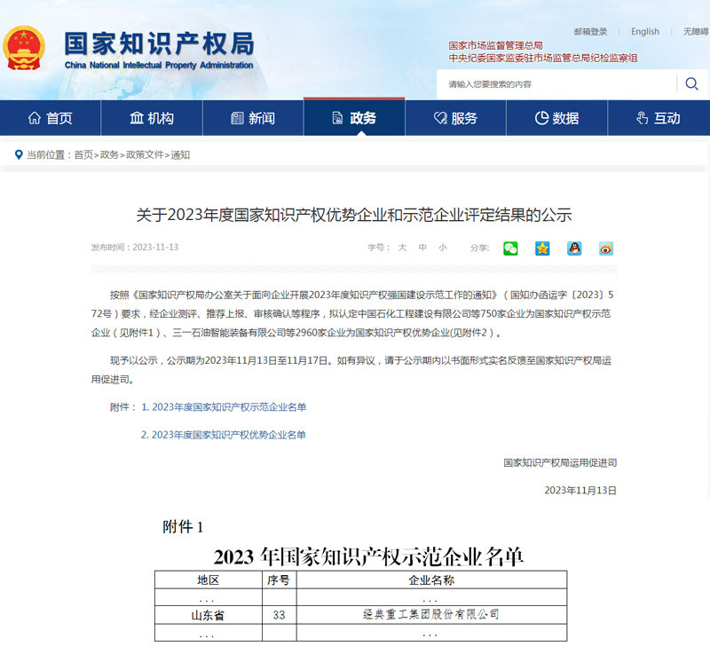 近日,國家知識產(chǎn)權(quán)局對2023年度國家知識產(chǎn)權(quán)示范企業(yè)和優(yōu)勢企業(yè)評定結(jié)果的公示。其中,經(jīng)典集團(tuán)被認(rèn)定為“2023年國家知識產(chǎn)權(quán)示范企業(yè)”。