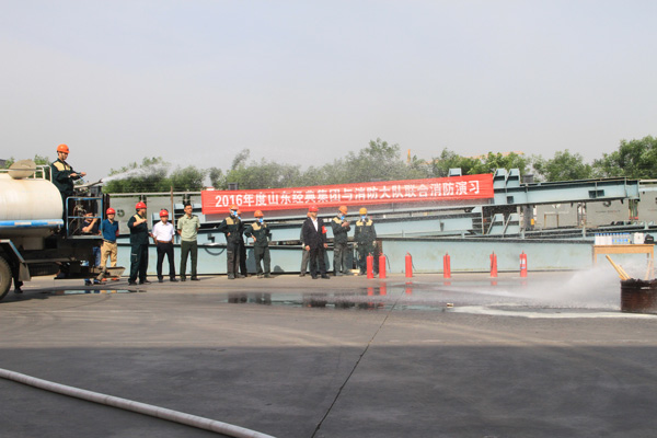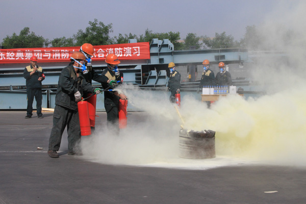 演習前,公司董事長苗樹文作了動員講話,對演習活動進行了部署。伴隨著消防警報響起,演習正式開始。消防應急救援隊立即集合,全副武裝到達指定地點,完成疏導交通和消防警戒,建立了應急通訊,集團領導下達救援命令后,一組救援人員手持干粉滅火器對準火源根部由近及遠進行掃射,迅速撲滅了火苗,二組救援人員使用高壓水槍對火源進行噴射,同樣達到了滅火的目的。演習結束后,區消防大隊趙怡然隊長對演習進行了指導點評。總經理杜福生對消防演習進行了總結,對消防安全工作提出具體要求。