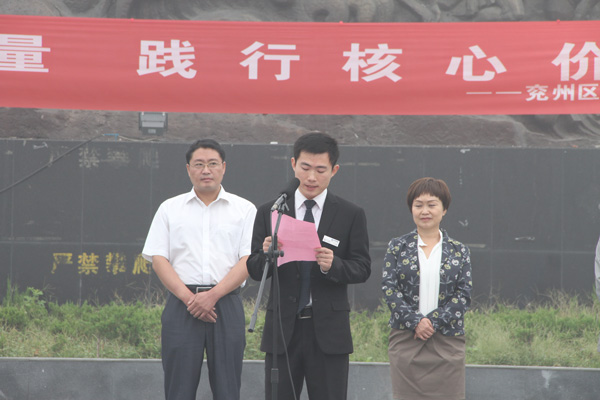 儀式由王仁娜副區長主持。區委宣傳部副部長邢衛紅宣讀了《兗州區弘揚社會正能量踐行核心價值觀倡議書》。集團公司志愿者卞中凱作為全區企業屆代表作了表態發言。儀式上頒發了活動宣傳書籍和資料。初建偉部長作了重要講話?;顒幼詈?,廣大志愿者們在活動條幅上鄭重簽下了自己的名字。
